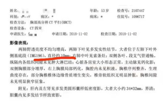 我拿着医生给开的一些化痰的和消炎药就回家了, 每天依旧的上课, 还是会咳嫩咳痰咳喘,当时的我还以为老师的职业病都是这样,我靠着抗生素,吃上就比较好,不吃又不行,我硬是扛过 一年的时间, 大概过了12个多月正好公司组织去体检的时候我复查了个Ct,拿到检查报告的时候着实把我吓一跳, 我的左肺结节最大的已经变成了10mm