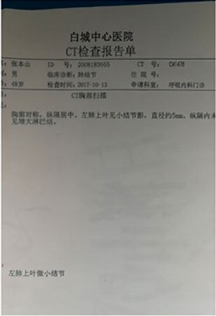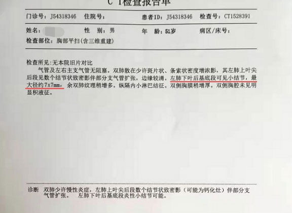 我今年52岁,教了一辈子的书,每天和黑板打交道,2017年的时候,有一段时间我总是感觉上楼的时候憋得慌,尤其是上课的时候总是感觉气不够用,胸口憋得慌,有点涨涨的疼,刚开始我也没放在心上,后就每天总是咳嗽,可以咳嗽出白色的痰,时间长了老婆说去检查一下吧,别是什么不好的病,我心里也有点忐忑,就去挂了个号去检查了一下,报告出来写着左肺上叶见小结节,直径约5mm, 医生当时说现在结节的大小没有到手术的程度,我的情况先回家观察,一年随访一次就可以,我看医生说的轻描淡写我就回家了,后来加了主任的微信fjzy198025才知道这样会留下了很大的隐患!